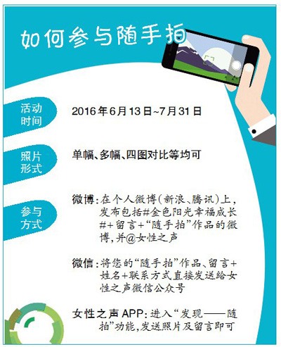 “无论是美图、趣图,还是暖图、炫图;无论是祖国的秀丽风光、人生的感人瞬间,还是与亲朋好友在一起的幸福时光,我们不设门槛,期盼大家倾情参与,倾吐心声。”6月13日,以“金色阳光·幸福成长”为主题,“巾帼心向党”新媒体随手拍活动在全国妇联“女性之声”两微一端新媒体平台启动。