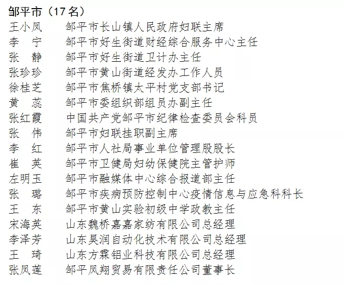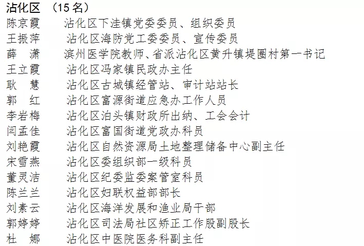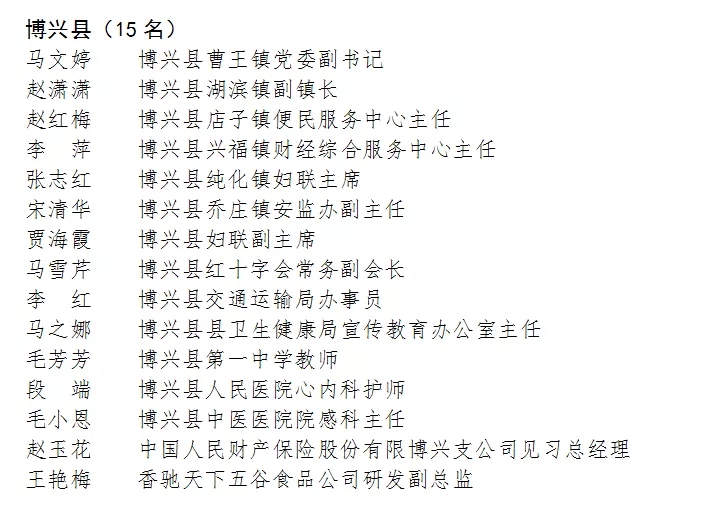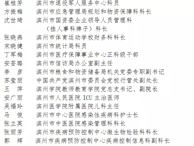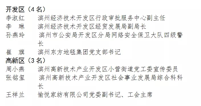 根据《关于开展滨州市三八红旗手(集体)评选活动的通知》(滨妇发〔2020〕4号),经组织推荐(包括社会化推荐)、资格审核、评委会评选、市妇联党组审定等程序,共评选出滨州市三八红旗手候选人199名,三八红旗集体候选单位100个。现将拟表扬名单予以公示(排名顺序不分先后),接受社会监督。