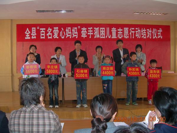 10月11日,惠民县举办“百名爱心妈妈”结对孤困儿童结对仪式,活动共收到并发放捐助款5万元,救助孤困儿童238名。