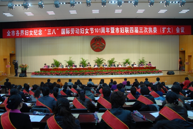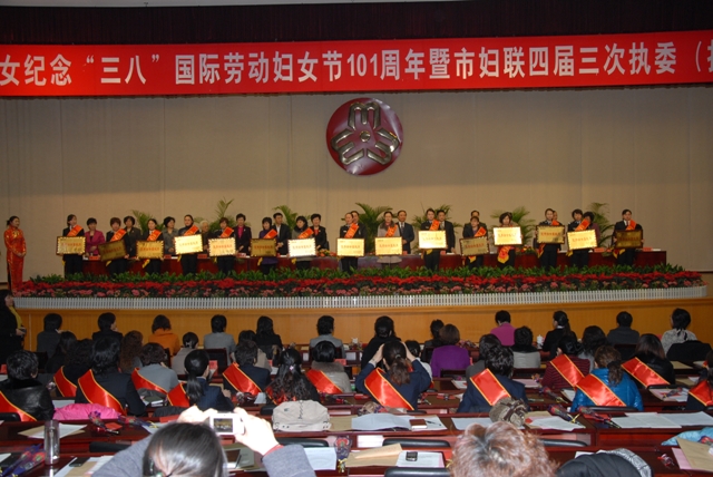 为隆重纪念“三八”国际劳动妇女节101周年, 3月4日上午,市妇联在市政大楼会务中心第一会议室召开全市各界妇女纪念“三八”国际劳动妇女节101周年暨市妇联四届三次执委(扩大)会议,总结回顾2010年度妇女工作,安排部署2011年工作任务,表彰在全市经济社会发展中作出突出贡献的妇女工作先进集体和先进个人。
