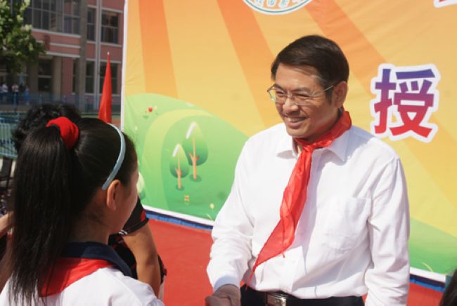 在授田英才学园教学楼前,一场主题为《我相信我成长》的庆“六一”文艺汇演正在进行。张光峰坐在同学们中间兴致勃勃地观看了演出。