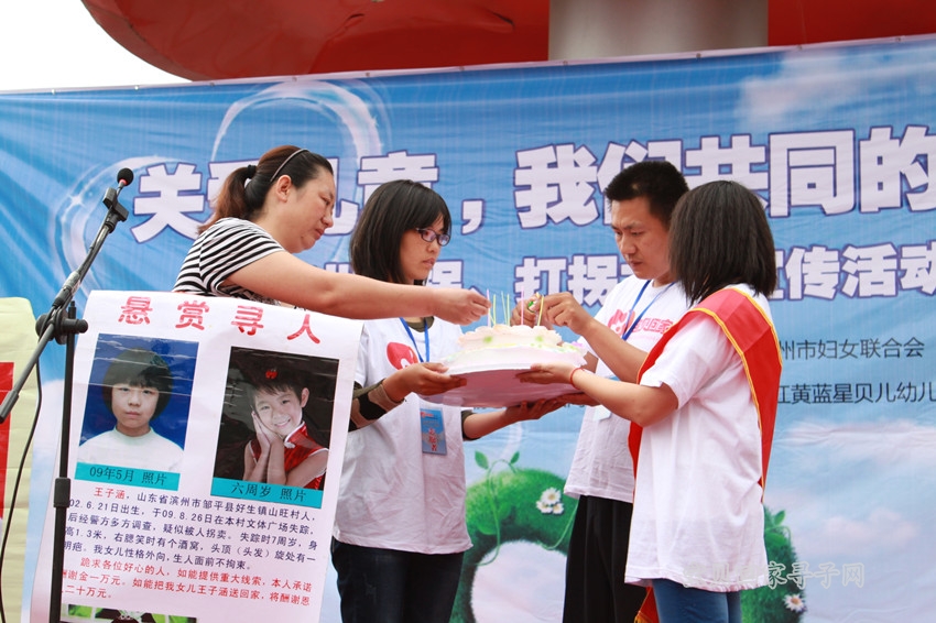 家住邹平县好生镇山旺村的房女士也来到活动现场,3年前她的女儿王子涵在山旺村文化广场失踪,今天房女士借此机会为不知身在何处的女儿庆祝即将到来的10周岁生日,并买来生日蛋糕,当志愿者端上生日蛋糕时,王子涵的妈妈早已泣不成声,上百名市民也一起为她唱起生日歌,哭声、歌声共同汇成了一首特别的隔空生日歌。