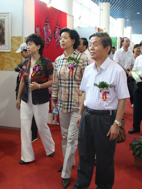 (市政府秘书长赵建明、市妇联主席郑玉梅陪同省妇联副主席玄祖香在手工精品展区)