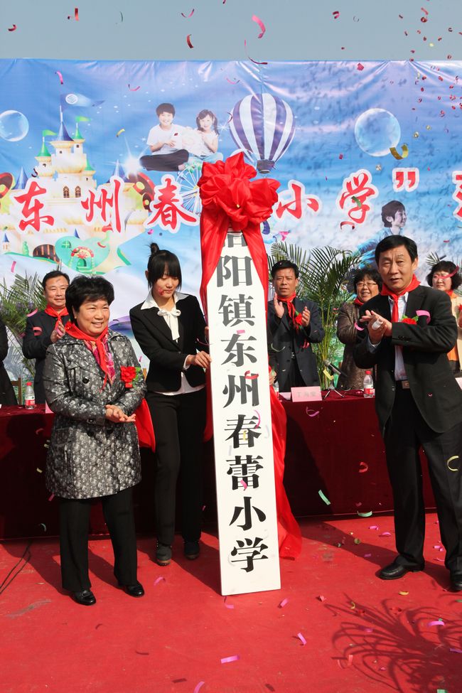 2012年11月9日上午,由日本友人深见东州先生援建、地方财政配套的“东州春蕾小学”落成仪式在无棣县信阳镇隆重举行,省妇联副主席任月英、儿童部部长韩莉莉,滨州市委常委、工会主席魏克田,市妇联主席郑玉梅以及无棣县委、县政府的有关领导出席落成仪式,信阳镇的有关领导及东州春蕾小学全体师生260人参加仪式。任月英副主席和魏克田主席为学校揭牌。东州春蕾小学前身是原信阳镇第七小学,是一所六年制小学,学校有在校学生285人,80%校舍是危房,学校教学场所严重不足,基本的功能室配备不全,实验课、信息技术课均无法正常开课,影响着素质教育的全面实施,急需新建。2011年5月在省妇联的积极争取和大力支持下,向中国儿基会为信阳第七小学申请到援建资金20万元,帮助修建春蕾小学。收到捐助后,当地政府多方努力,积极筹措,完成申报、立项、规划、勘察设计、招投标等前期准备工作,于2011年6月25日开工建设,2011年10月主体项目竣工。目前学校总建筑面积1200平方米,新建校舍48间,厕所8间,院墙309米,工程总投入资金110余万元。东州春蕾小学的建成,可为450多名儿童提供学习、生活、休息为一体的优质配套的现代教学服务,将从根本上解决信阳乡附近10个自然村的学龄儿童上学难的问题。