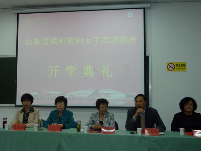 4月18至23日,滨州市妇联在浙江大学继续教育学院举办了全市女干部培训班。浙江大学继续教育学院副院长郭常平、院长助理丁静出席了开学典礼,市妇联主席杨淑云同志在开学典礼上向全体学员提出三点希望:一是坚持理论学习,在提高政治理论素质上下功夫;二是树立创新意识,在提高领导水平和领导能力上下功夫;三是树立进取意识,在塑造新时期妇女干部自身形象上下功夫。