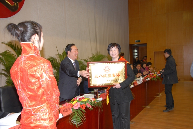 (市委副书记王浩向滨州中心医院“爱心妈妈”代表颁发市“三八”红旗集体奖牌)