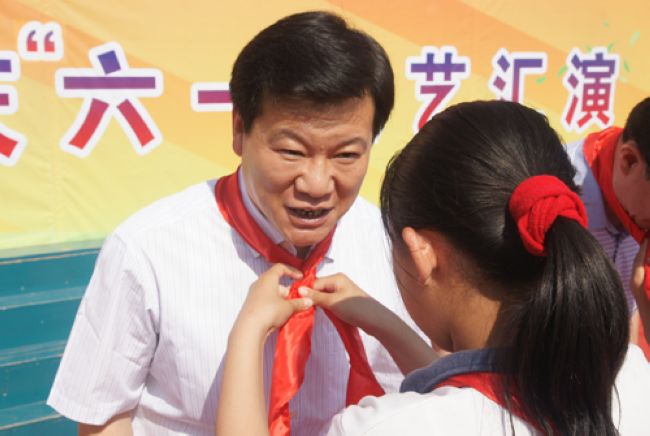 在授田英才学园教学楼前,一场主题为《我相信我成长》的庆“六一”文艺汇演正在进行。张光峰坐在同学们中间兴致勃勃地观看了演出。